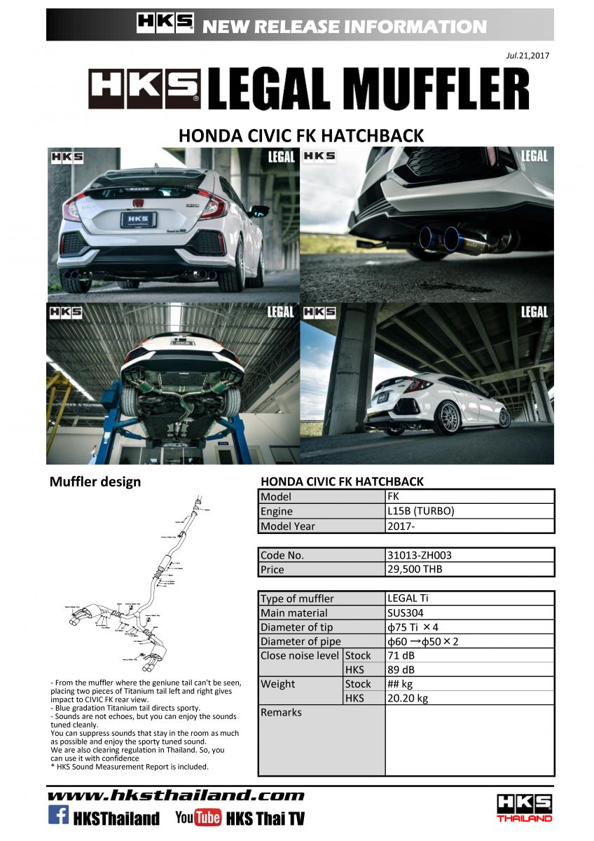 | FK | L15B (TURBO) | 1500 cc | 2017-2020 | LEGAL Ti | SUS304 | 4 | 31013-ZH003 | ฿29,500 | Click | TWIN TITANIUM TAIL | |