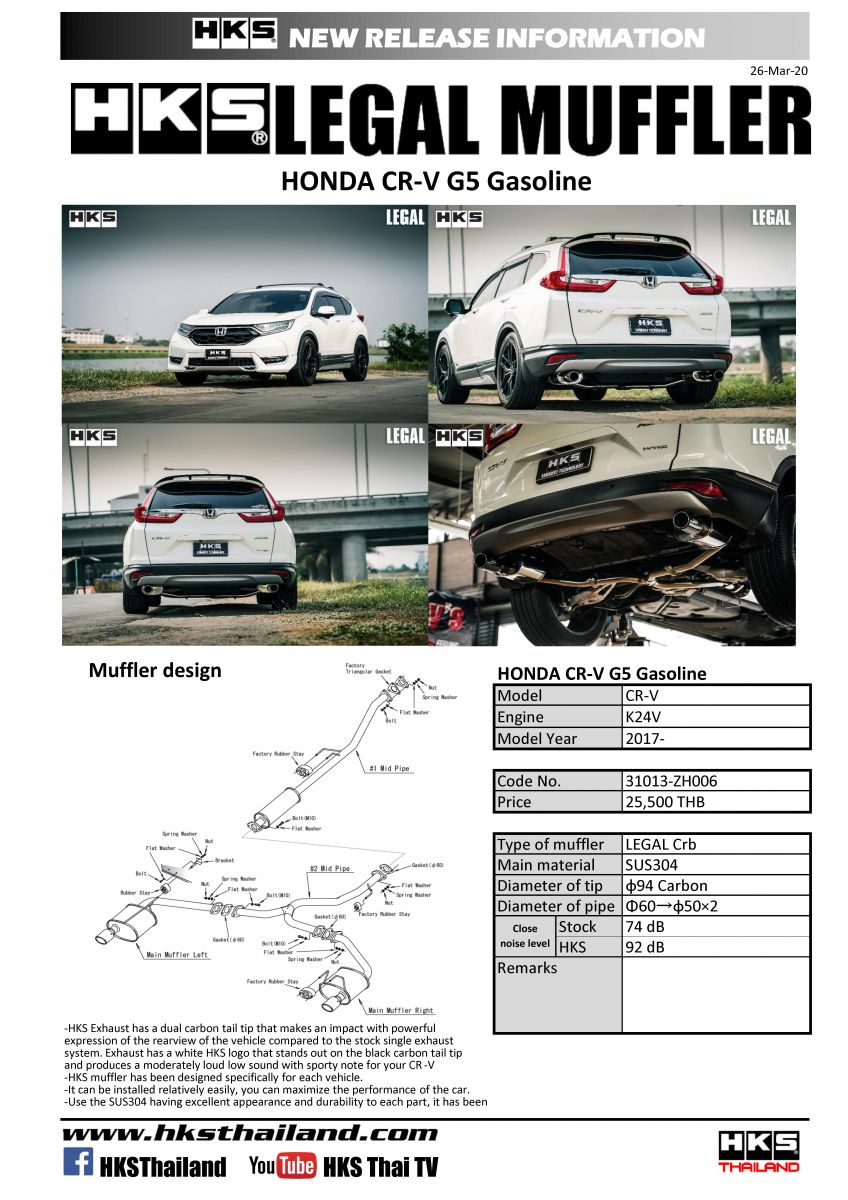 | CR-V | G5 | K24V5 | 2400 cc | 2017- | LEGAL | SUS304 | 4 | 31013-ZH006 | ฿25,500 | Click | Carbon TAIL (Dual) |
