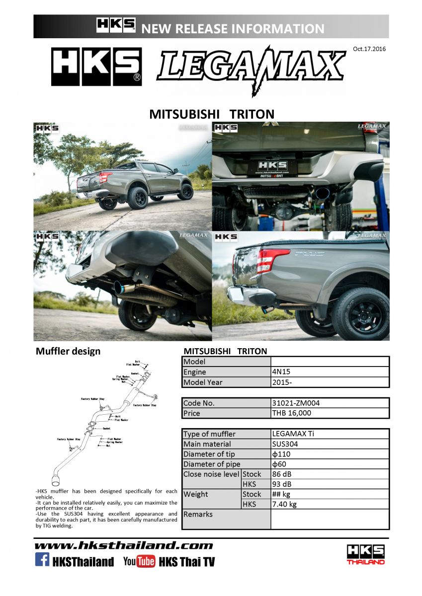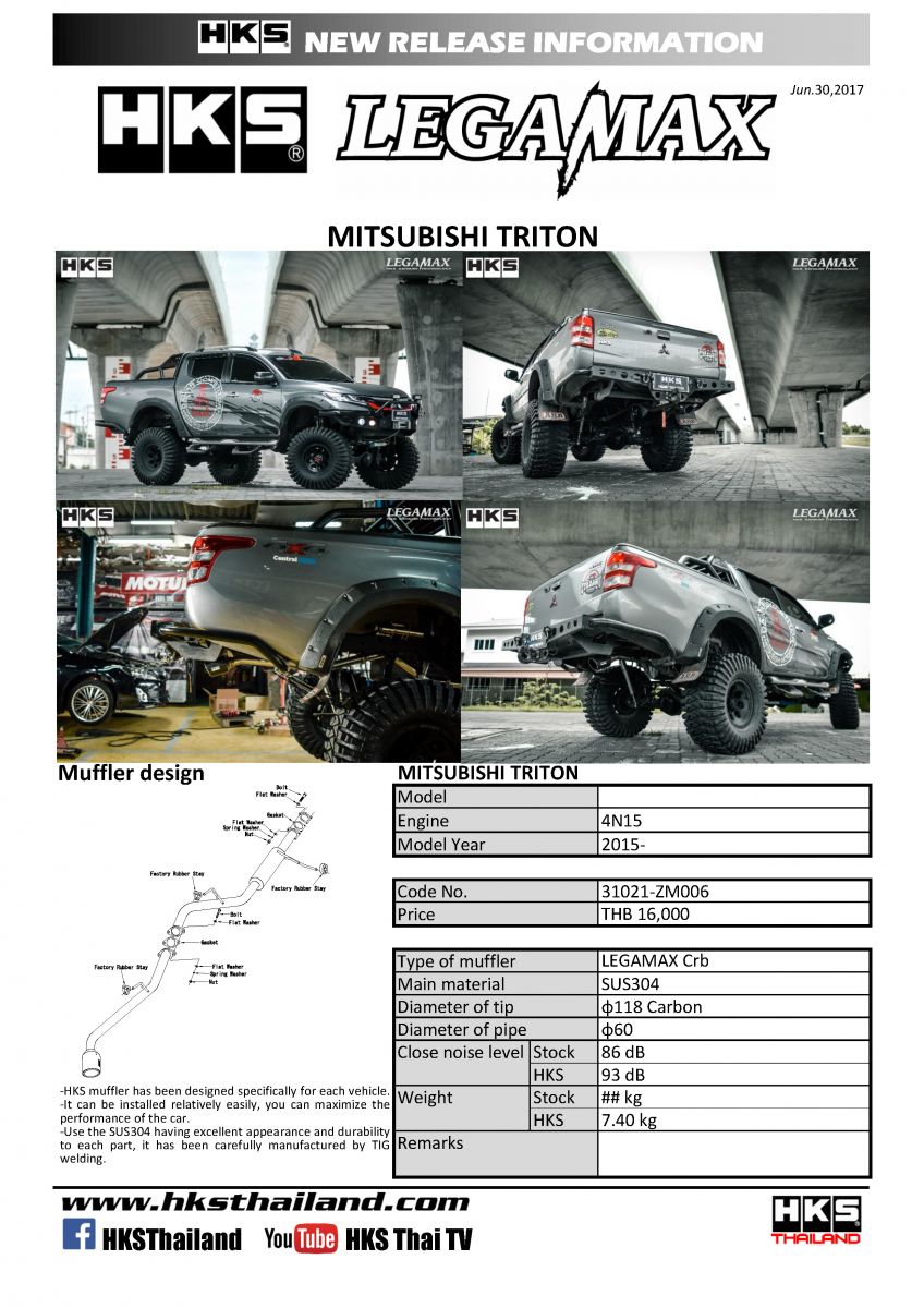 | NEW TRITON | L200 | 4N15 | 2400 cc | 2015- | LEGAMAX | SUS304 | 2 | 31021-ZM004 | ฿16,000 | Click | TITANIUM TAIL |