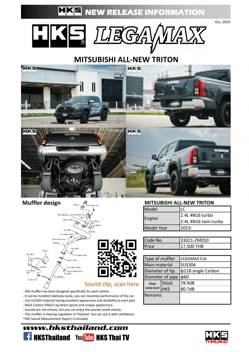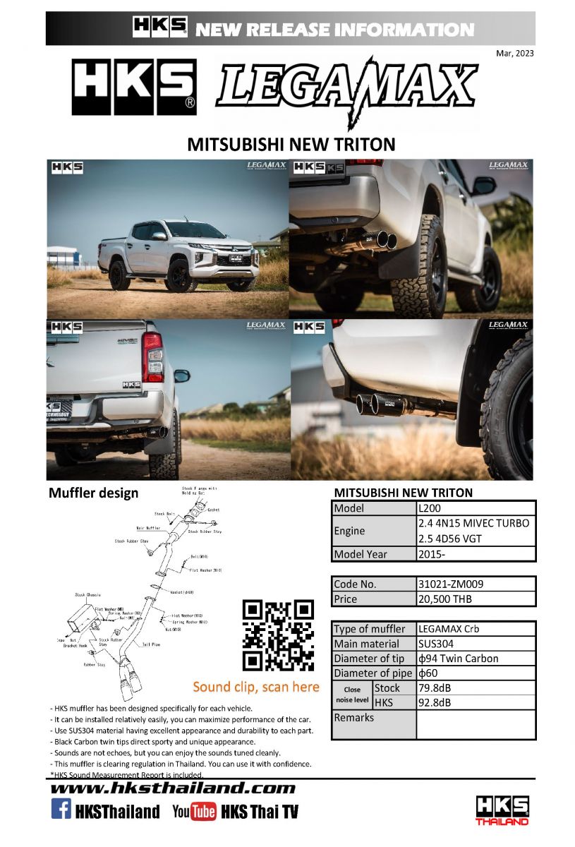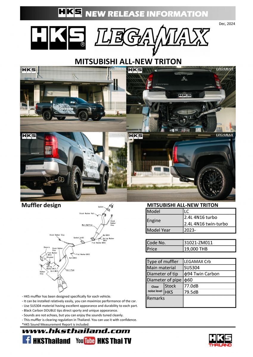 | ALL-NEW TRITON | LC | 4N16 TURBO | 2400 cc | 2023- | LEGAMAX | SUS304 | 3 | 31021-ZM010 | ฿17,500 | Click | Carbon TAIL (Single) |