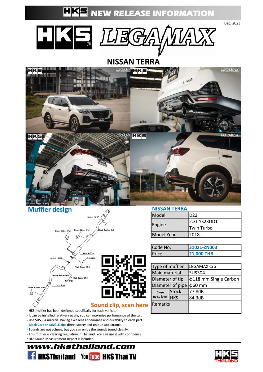 | TERRA | D23 | YS23DDTT | 2300 cc | 2018- | LEGAMAX | SUS304 | 2 | 31021-ZN003 | ฿21,000 | Click | Carbon TAIL (Single) |