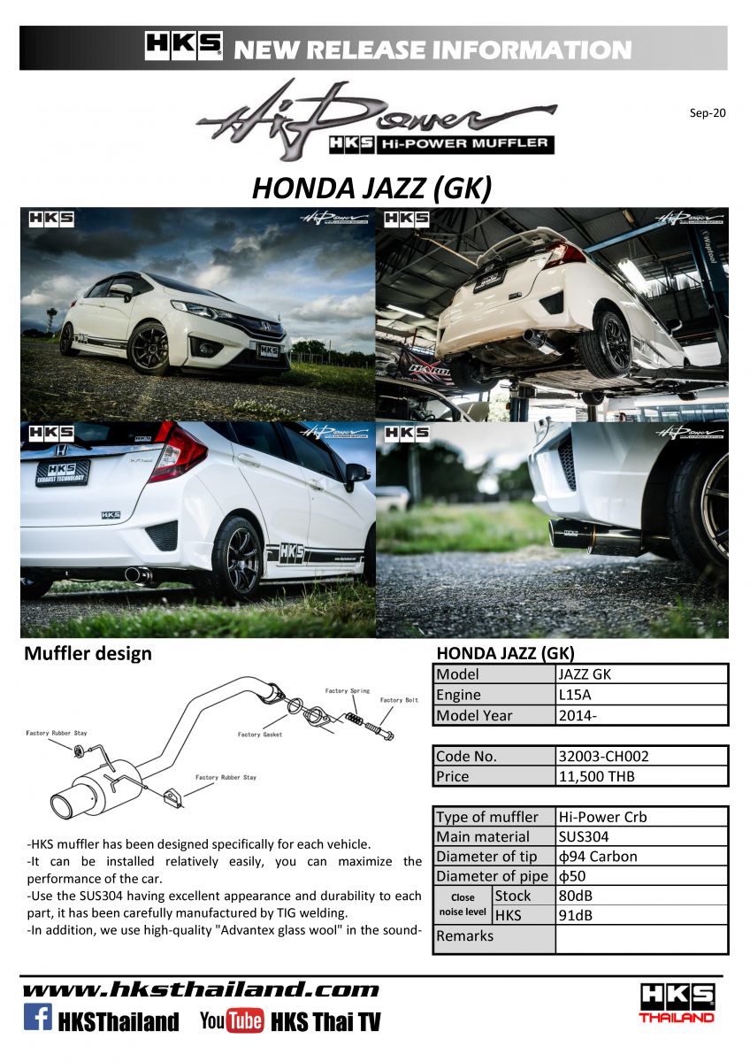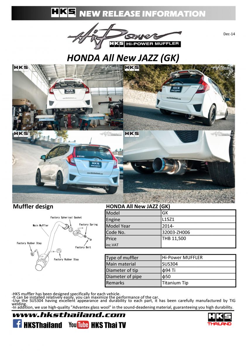 | JAZZ | GK5 | L15A | 1500 cc | 2014- | Hi-Power Ti | SUS304 | 1 | 32003-ZH006 | ฿11,500 | Click | TITANIUM TAIL |