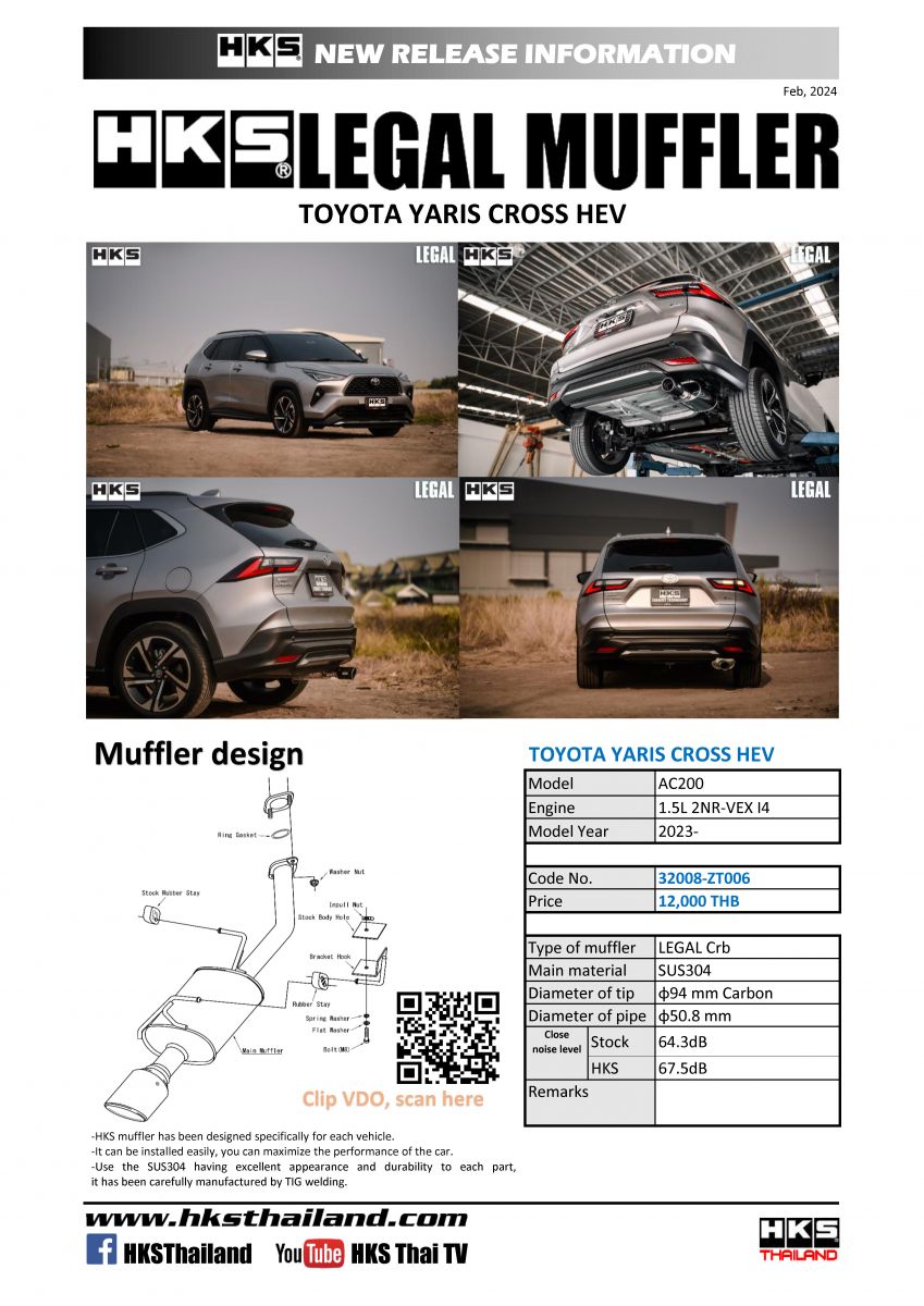 | YARIS CROSS HEV | AC200 | 2NR-VEX | 1500 cc | 2023- | LEGAL | SUS304 | 1 | 32008-ZT006 | ฿12,000 | Click | Carbon TAIL (Single) |
