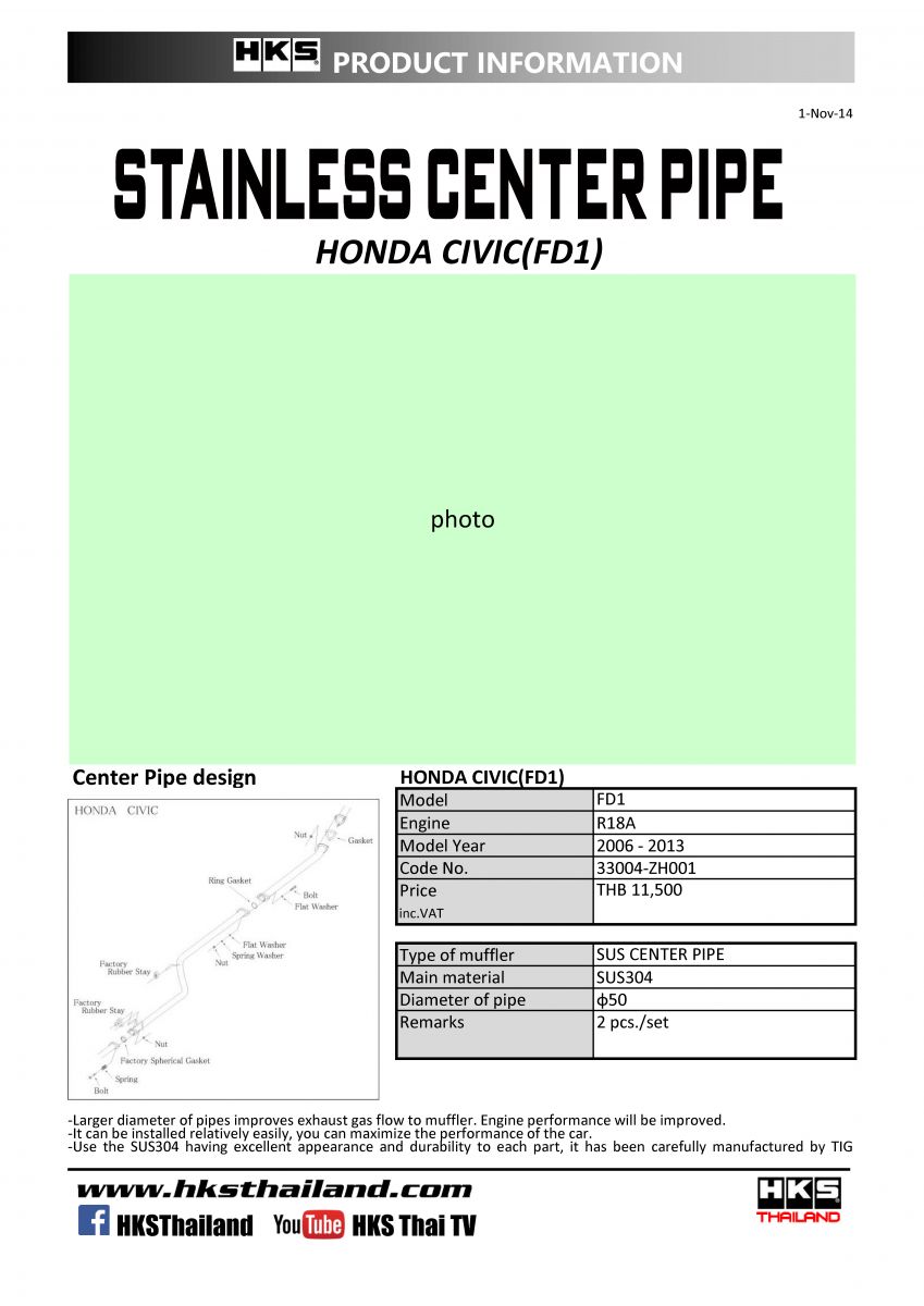 | FD1 | R18A | 1800 cc | 2006-2013 | CENTER PIPE | SUS304 | 2 | 33004-ZH001 | ฿11,500 | Click | ||